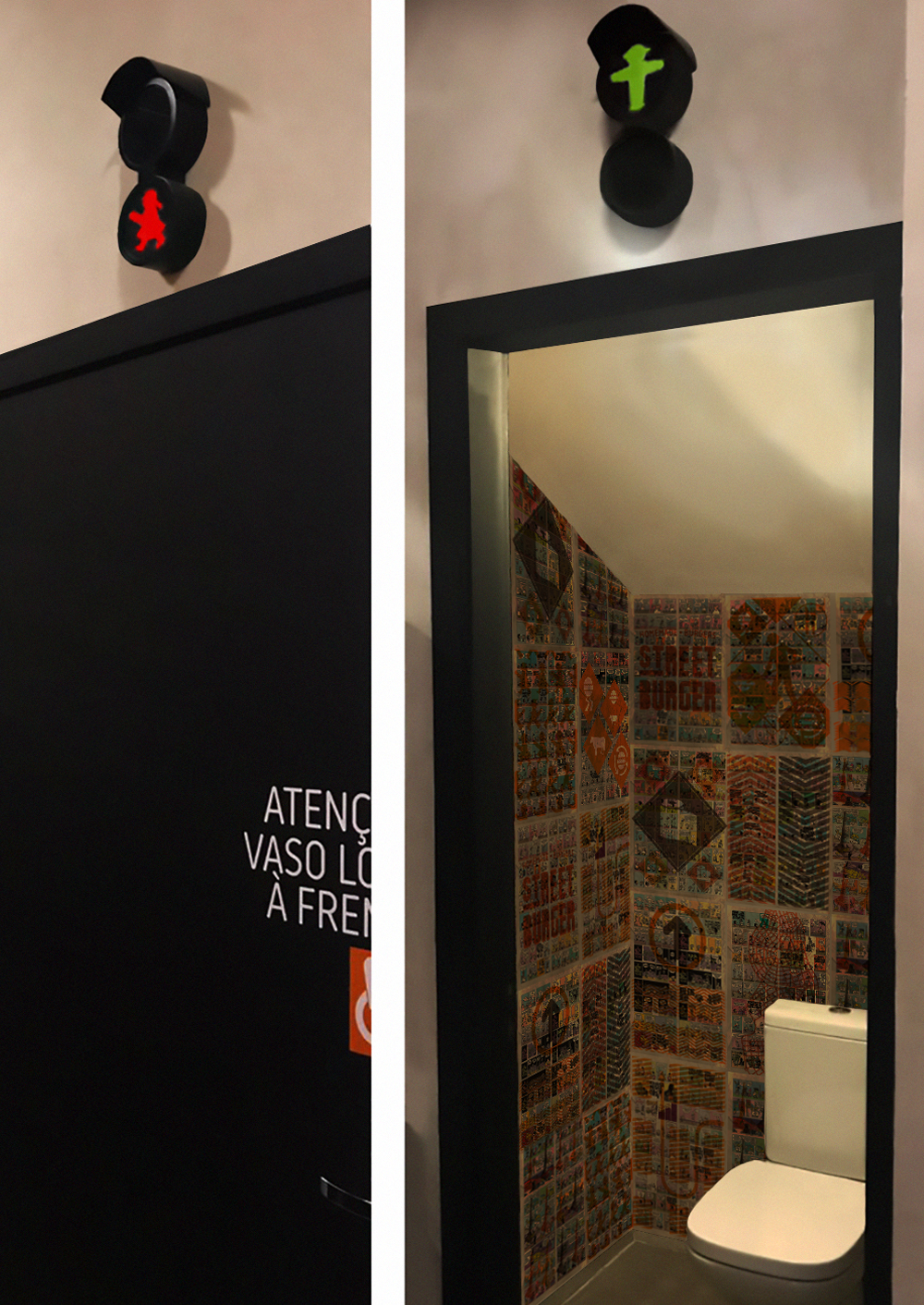 For the design of the new Street Burger restaurant, among many experiences, we brought the signage of the toilets directly from the streets of eastern Berlin, the ampelmann, that little man with a hat at the Gothic traffic lights. Also, the walls stuffed comic strips ensure congestion in the use of the restrooms! It’s to go to Street Burger and check it out!