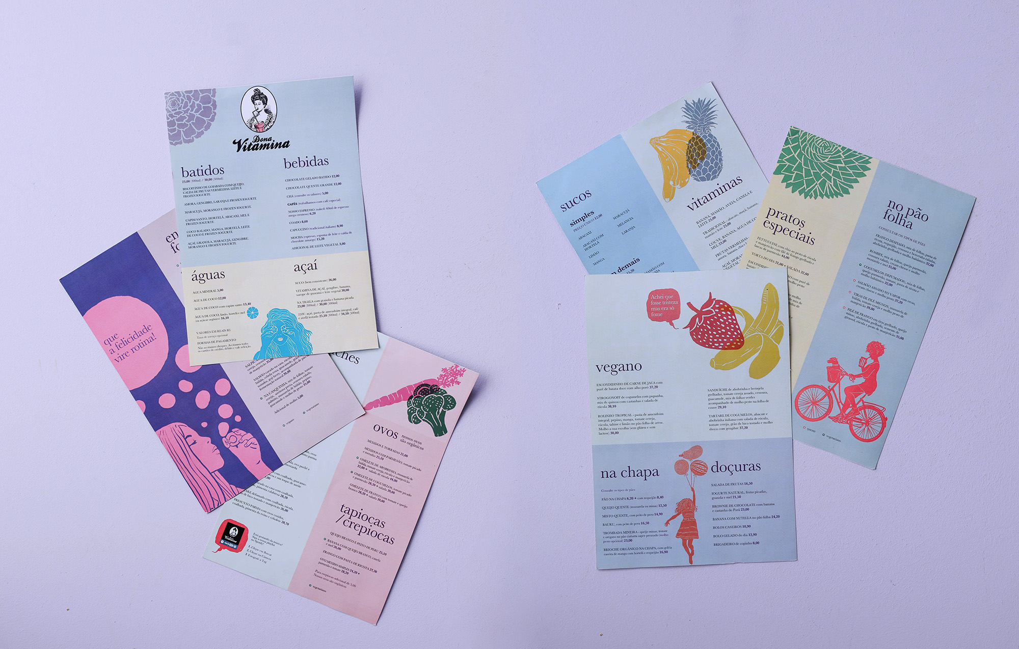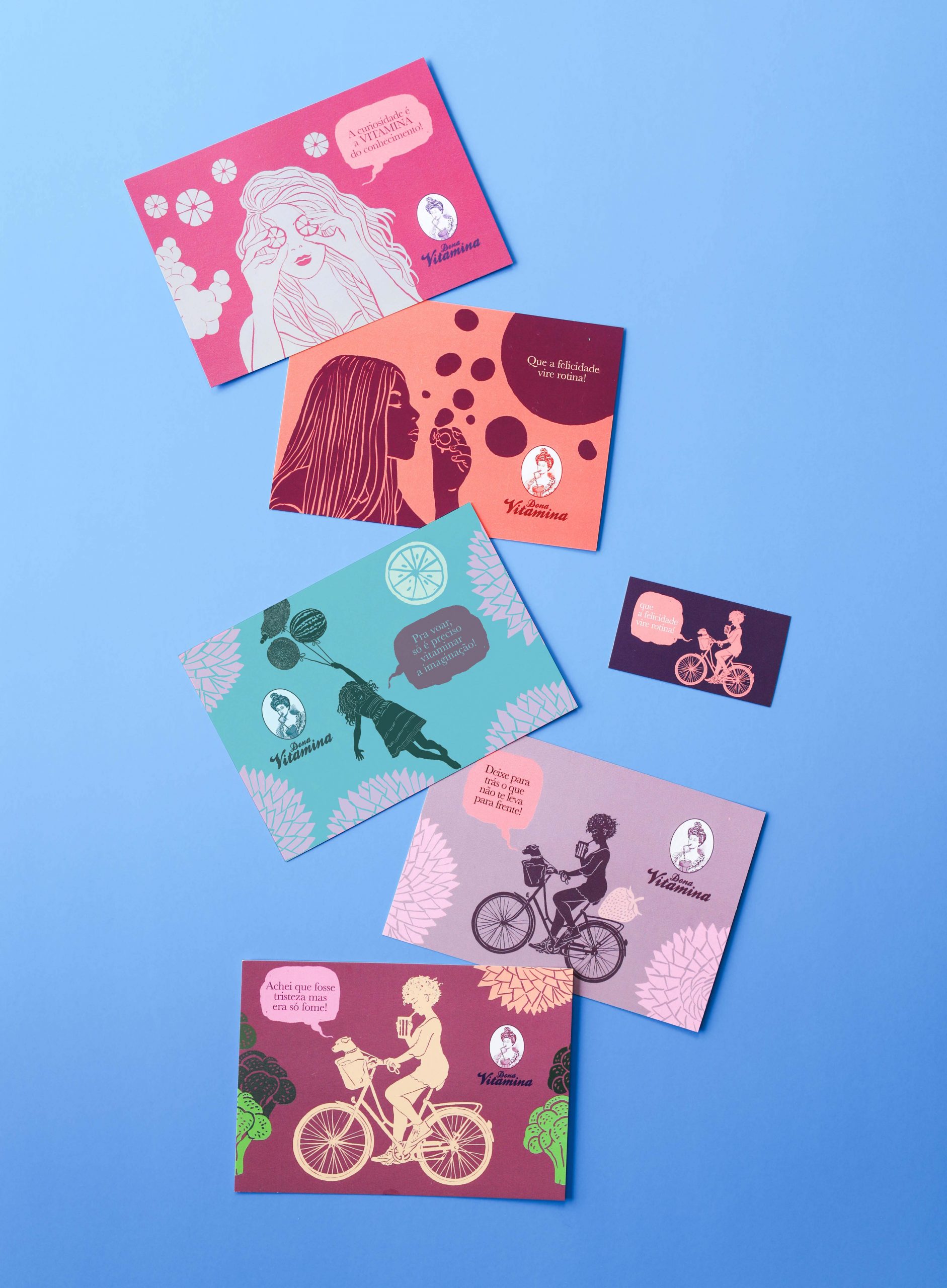 A Laika criou uma série de narrativas com mulheres, outras Donas Vitaminas, que contemplam outras etnias e outros vieses do feminino, mas sempre mantendo a essência disruptiva da marca – a marca é uma senhora vitoriana vesga a tomando um suco. Espalhadas em design de superfície, embalagens, cardápios e muito mais, essas mulheres são a síntese do espírito divertido e atemporal da marca.