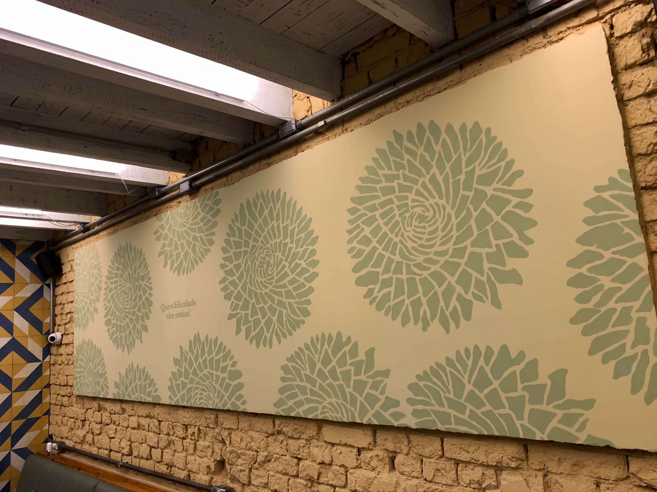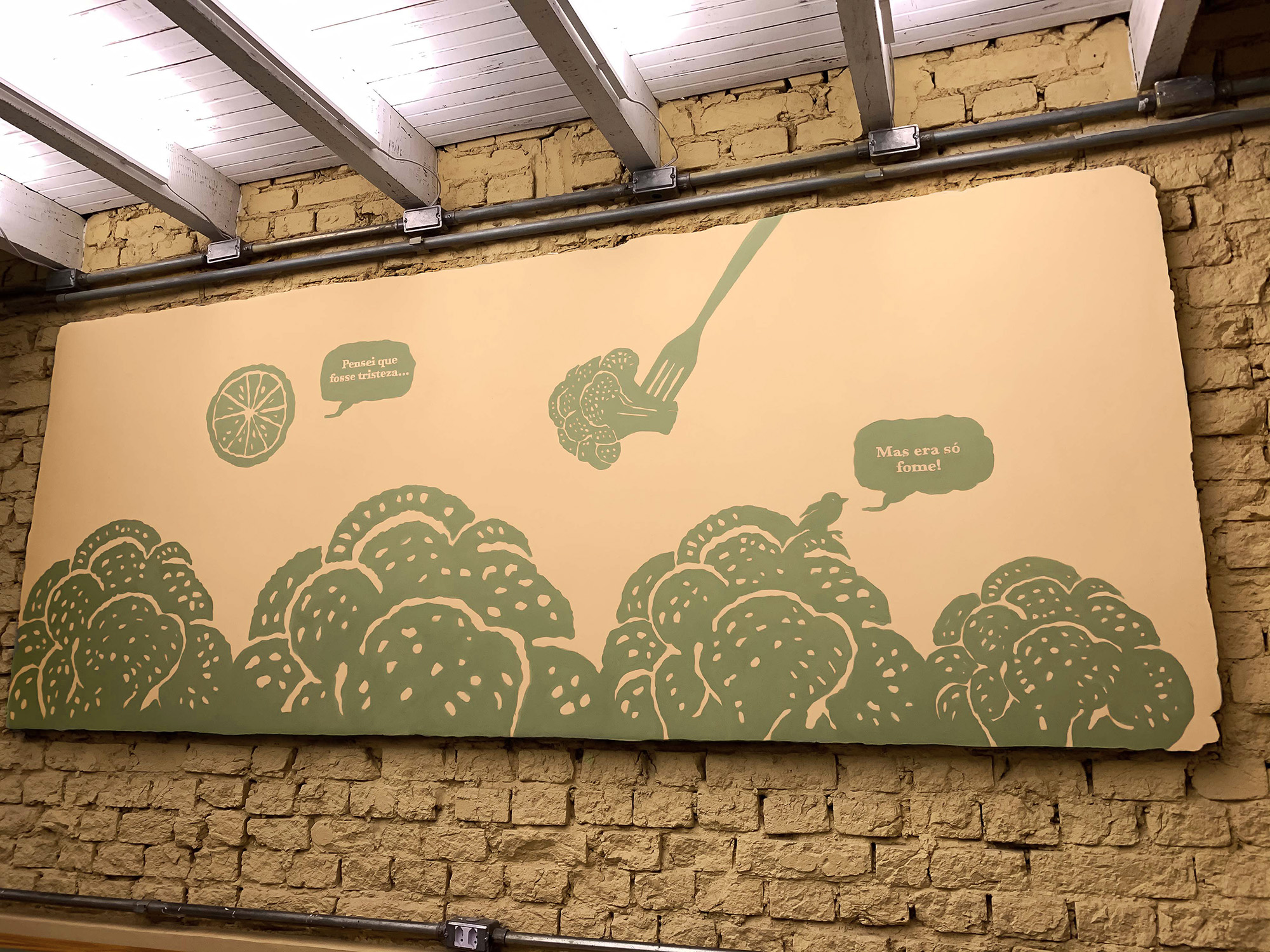 A ocupação do espaço do restaurante acontece com murais produzidos com muita tinta e pincel pela Laika, criando diálogo entre os elementos da marca com design de interior e projeto arquitetônico.